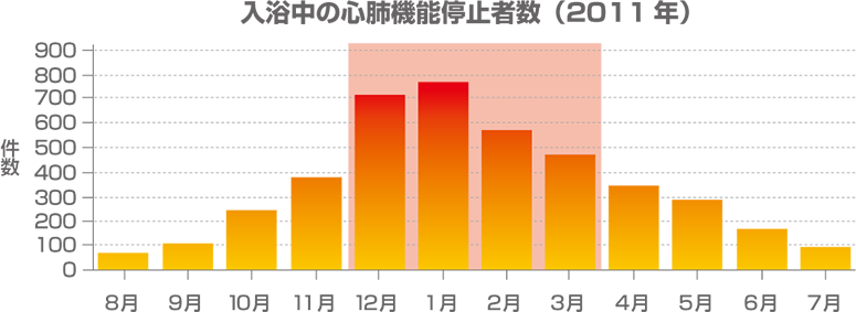 ヒートショックは、体全体が露出する入浴時に多く発生します。