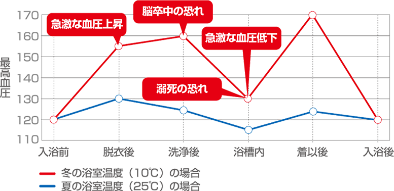 寒い脱衣所で衣類を脱ぐと、急激に体表面全体の温度が10度程度下がります。すると寒暖刺激によって血圧が急激に上がります。
