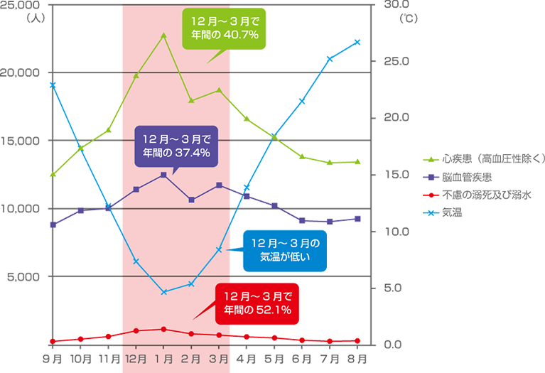 家庭内では、裸になり熱い湯に入る冬季の入浴中に起きやすく、入浴中の事故で亡くなる人は年間1万人を越えるといわれています。