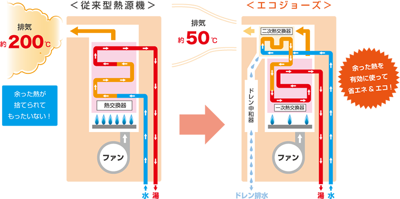 今までの給湯器と違って、排気熱を上手に活用して効率よくお湯を沸かします。エコジョーズでは、今まで使わずに捨てられていた排気熱を有効に利用して、あらかじめ水を温めます。そのため、従来よりも少ないガス消費量で、効率よくお湯が沸かせます。