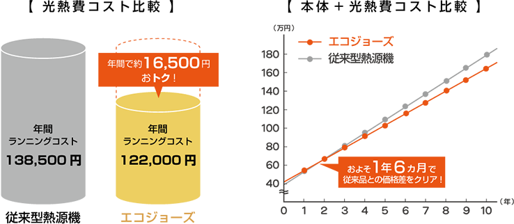 給湯器購入時の本体価格は従来型よりもエコジョーズの方が高額。しかし、毎年のランニングコストの差額を見ると、およそ1年6ヵ月で従来型との価格差をクリアします。