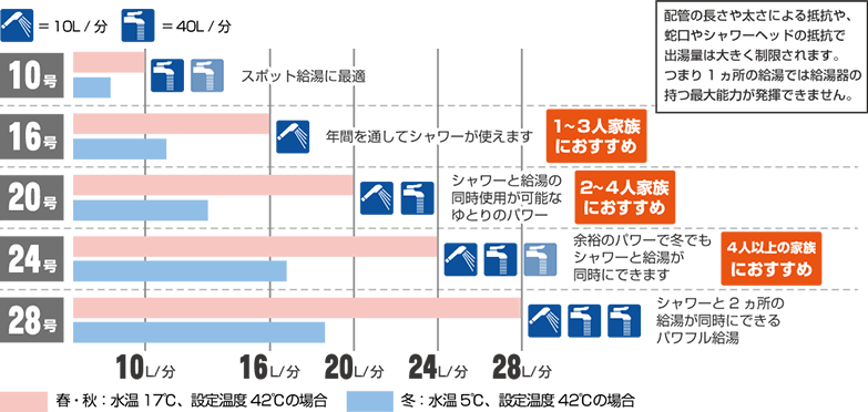 給湯器の号数が大きいものほど大量のお湯を使うことが可能ですが、夏に比べ冬は水温が下がるため、お湯の量は少なくなります。なので、冬の事も考え、少し号数の大きめの給湯器を選びましょう。